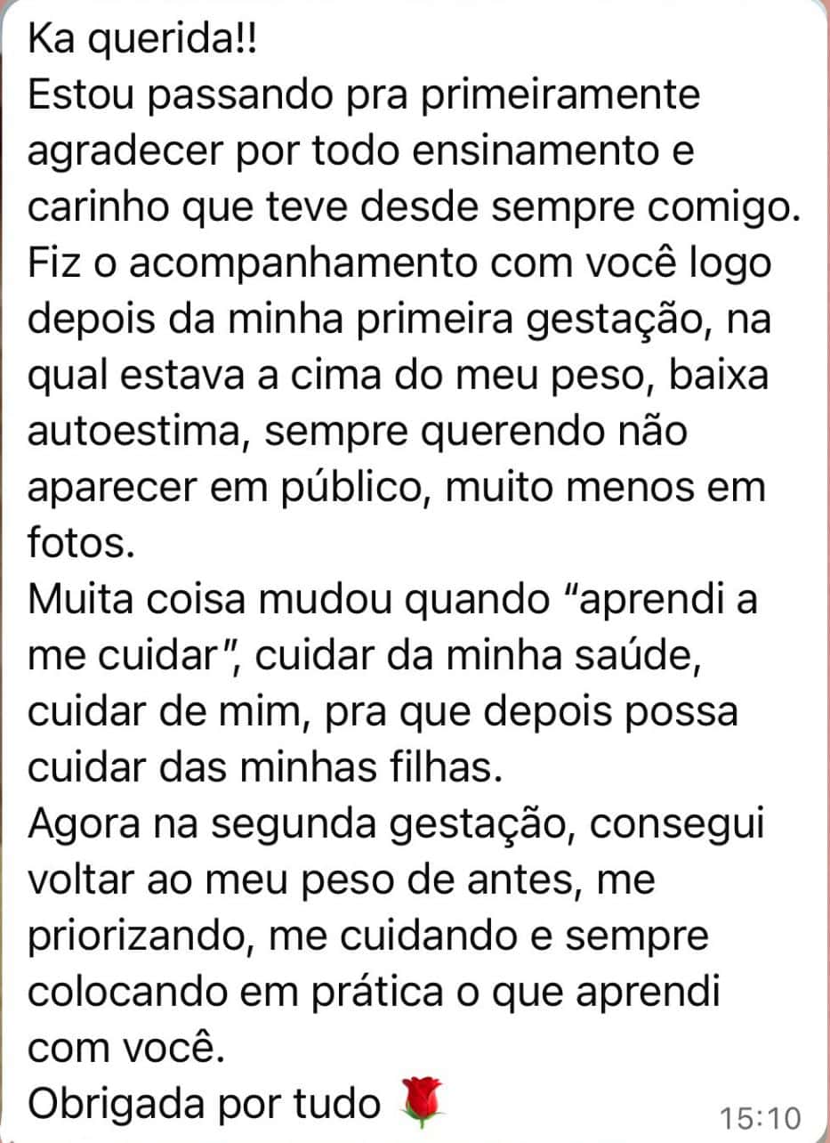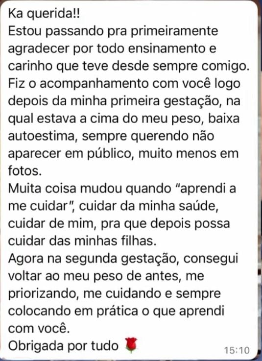 Essa experiência me fez entender na pele o que tantas mulheres sentem e foi o que me inspirou, há mais de 8 anos, a trabalhar com o que hoje é a minha missão: ajudar mulheres a se reencontrarem através do emagrecimento leve e consciente.